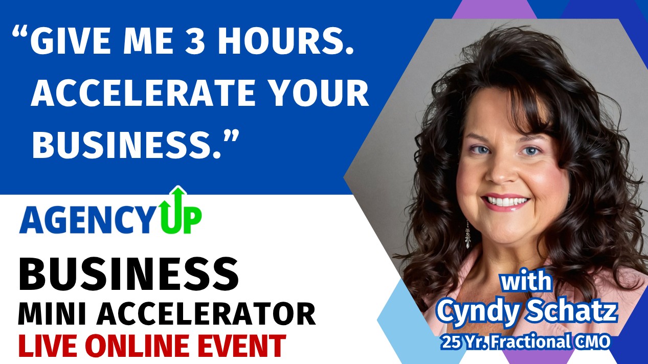 SAN ANTONIO, TX - July 13, 2025 - AgencyUP™, founded by 25-year advertising veteran and Fractional CMO Cyndy Schatz, today announced its annual Business Mini-Accelerator, a live online training that equips small-business owners and in-house marketing teams with C-Level marketing playbooks in just three hours. July 23rd is already sold out; spots still remain for July 24 (2:00 p.m. EST), and a 3rd date just added for July 29 (10:30 a.m. EST) with spots filling fast ahead of the July 15 early-registration deadline.