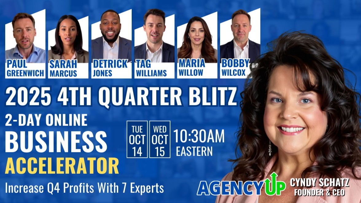 AgencyUP’s 4th Quarter Blitz Online Conference delivers 2 days of value-packed training for Small Business Owners to drive success in Q4 and build momentum to carry into the new year.
