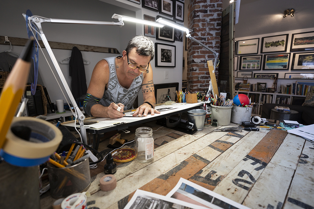 Larry Paul also frequently uses sunsets and volcanic skies that are inspired by the artist’s visits to Anna Maria Island, Cortez, Florida and Hawaii, where Larry Paul previously worked as a ranger for the Hawaii Volcanoes National Park. In addition to this, he frequently uses angry thematic drawing expressions, aiming to present bold, erratic tones using strict color contrasting.