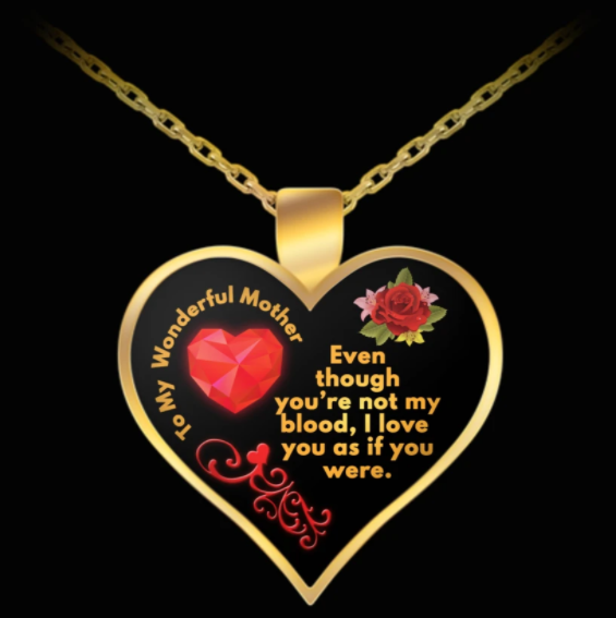 The necklace features a gold-plated pendant with an image of an illustrated rose and heart in the center. The illustration is accompanied by the text “To My Wonderful Mother, Even Though You're Not My Blood, I Love You as if You Were” and some delicate red scroll detailing.