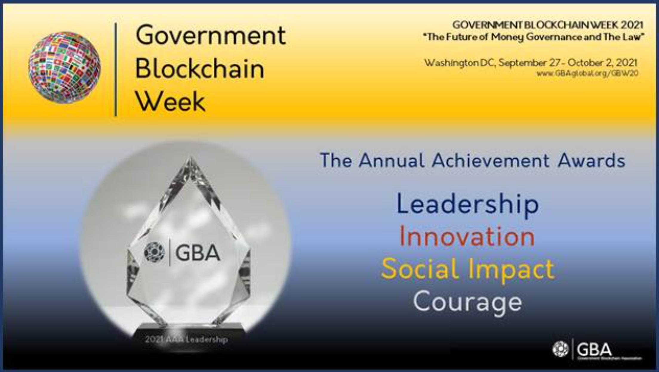 Government Blockchain Week Announces Annual Achievement Awards. Washington DC Sept 27th-Oct 2nd, 2021.