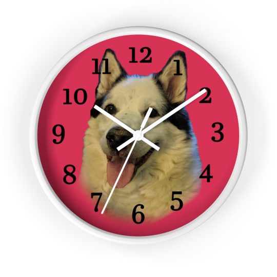 The custom pet face wall clock allows a pet owner to make their pet center stage in their own home. The home decor piece features the chosen pets face on a bright background, has a wooden frame and a plexiglass face.