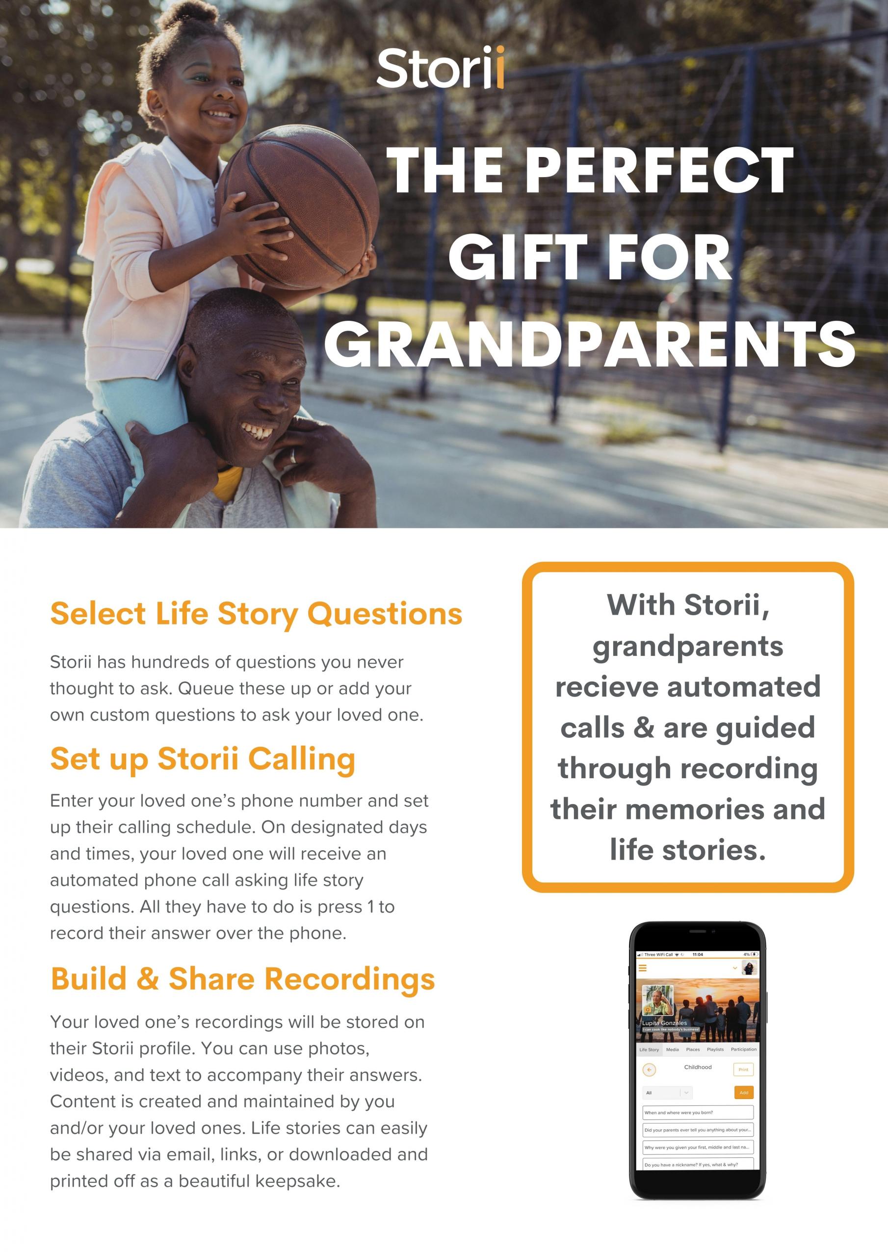 A spokesperson for the company said, "Looking for something special to give your grandparents or a great gift idea? Storii guides families and individuals in digitally recording memories and stories they want to preserve for their loved ones."