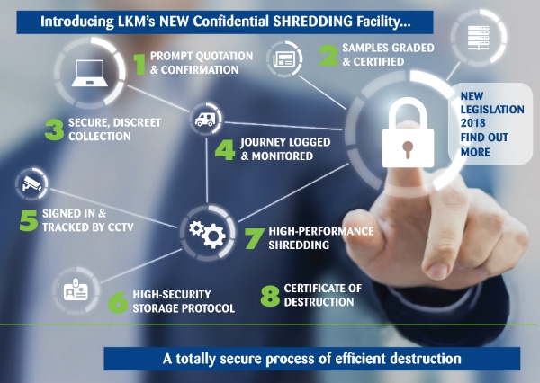 The LKM Recycling team explains that “as a leading provider of waste destruction and management solutions with more than 30 years in the industry, we are in a unique position to offer a secure shredding and destruction service with accountability and monitoring that can ensure peace of mind for the UK organisations who generate sensitive commercial collateral and need to keep their business confidential to protect their intellectual property, brand integrity and commercial advantage.”