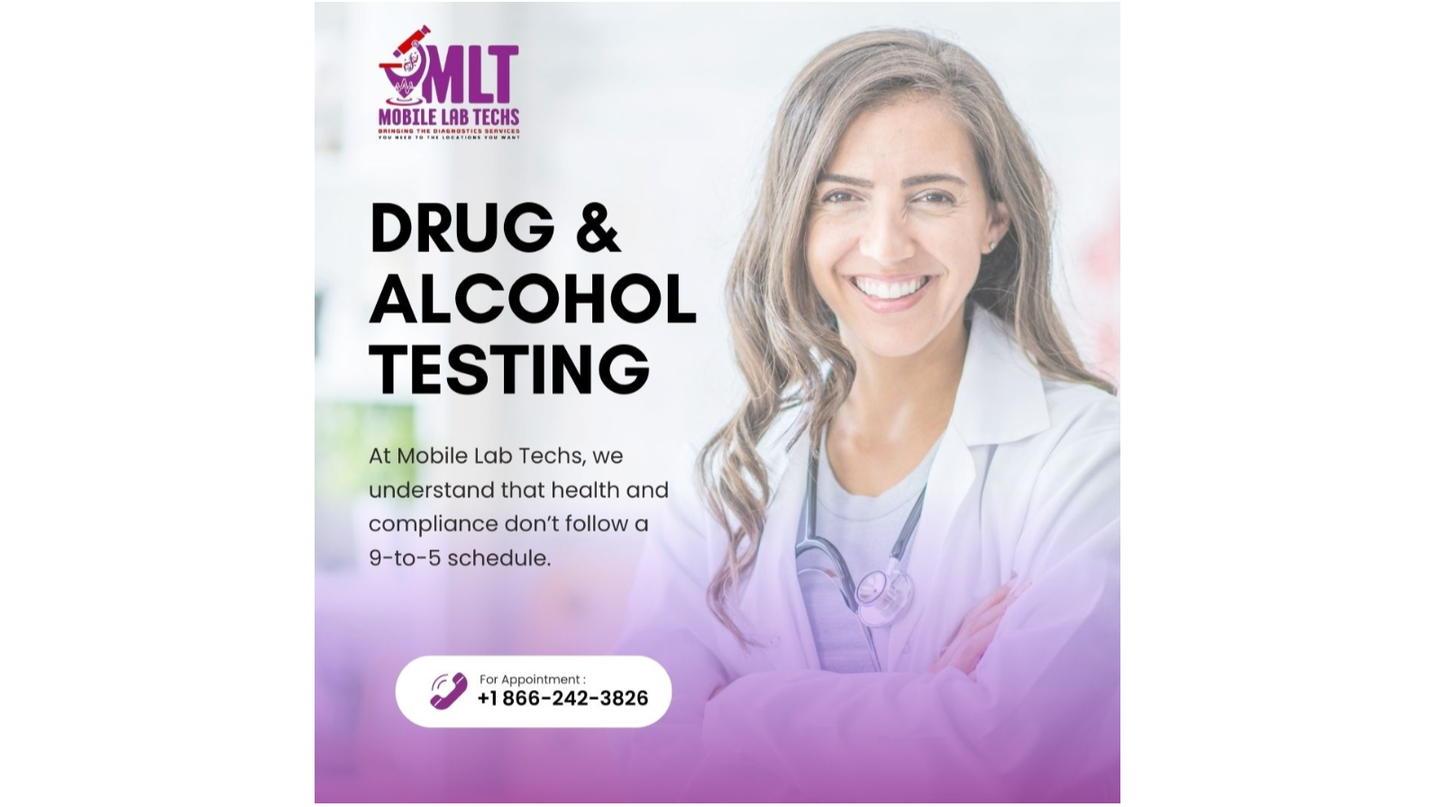 Transportation companies interested in learning more about mobile DOT compliance testing can contact Mobile Lab Techs at 866 242 3826 or visit Https://WWW.MOBILELABTECHS.COM.